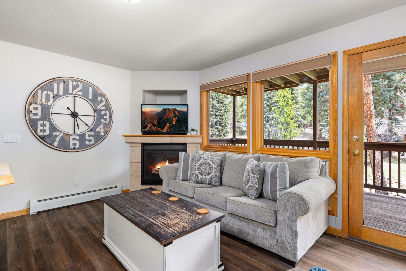 This beautiful 1-bedroom condo features a King bed and bathroom with over-sized jetted tub/shower combo. The living room features windows overlooking Fall River and a cozy gas log fireplace. The kitchenette with breakfast bar is completely equipped with all the essentials! Your private deck with patio furniture overlooks Fall River, where you will see Elk, Deer and other wildlife! Wi-Fi, River Fishing, everything you need for your mountain retreat!